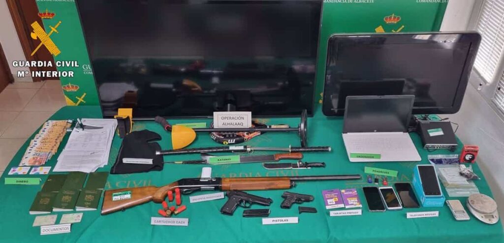 Dentro de la operación se han localizado a 11 víctimas y se han realizado registros en 11 viviendas donde, además de 1.000 euros en efectivo, encontraron una escopeta y dos pistolas, así como dos machetes, una catana y varias armas prohibidas, ya que, según ha indicado el teniente coronel, la organización estaba planeando un robo con fuerza.