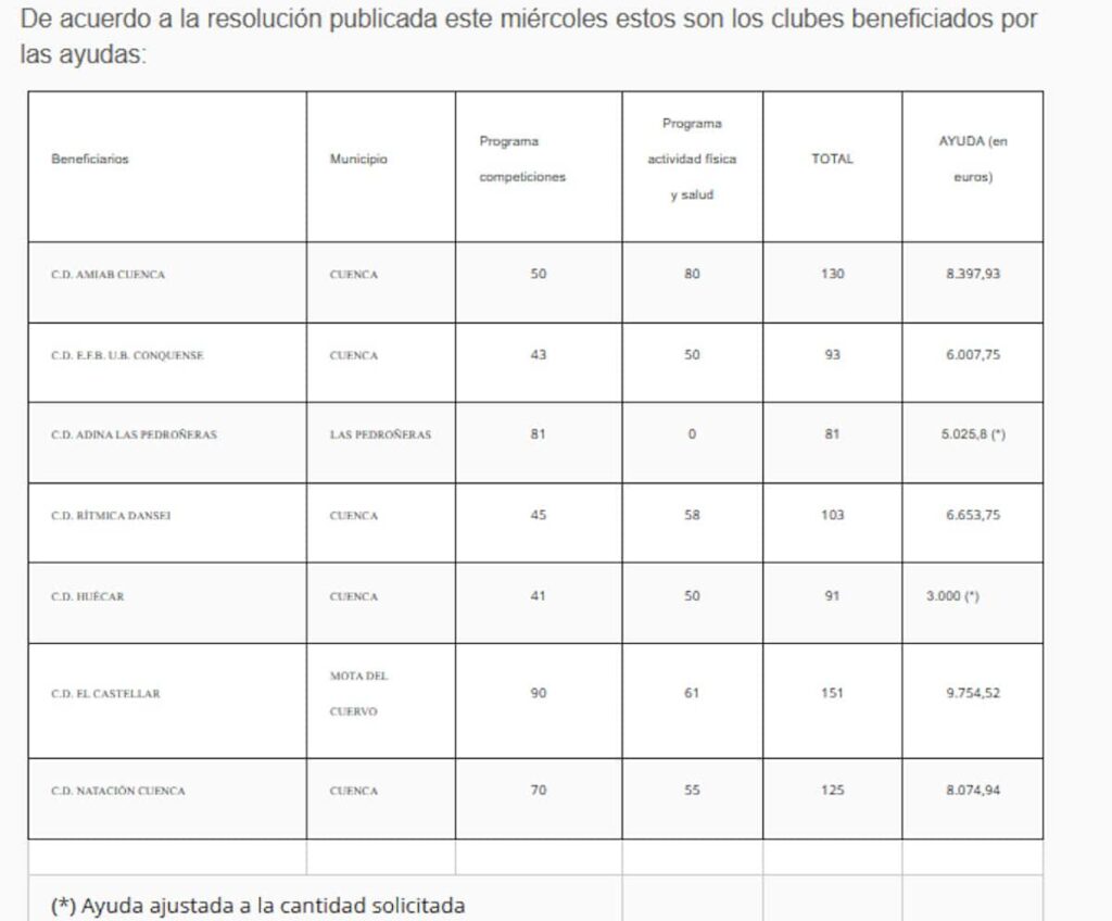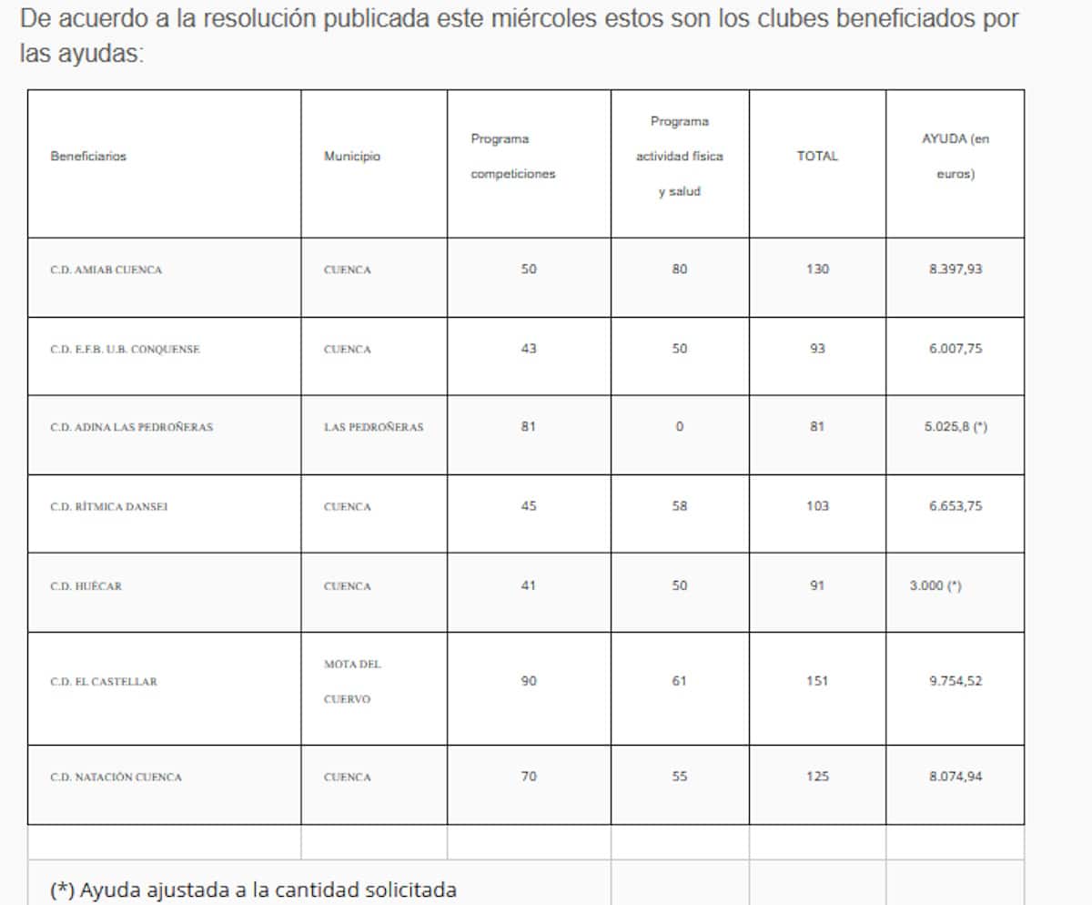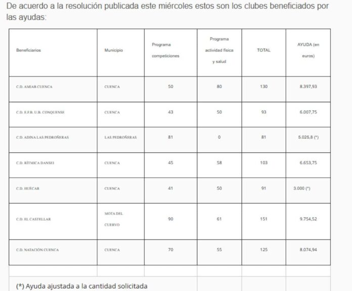 De acuerdo a la resolución serán siete los clubes deportivos que recibirán fondos para organizar actividades en las dos líneas de ayudas en municipios como Cuenca capital, Las Pedroñeras o Mota del Cuervo con unos importes que van desde los 3.000 a los 9.750 euros.