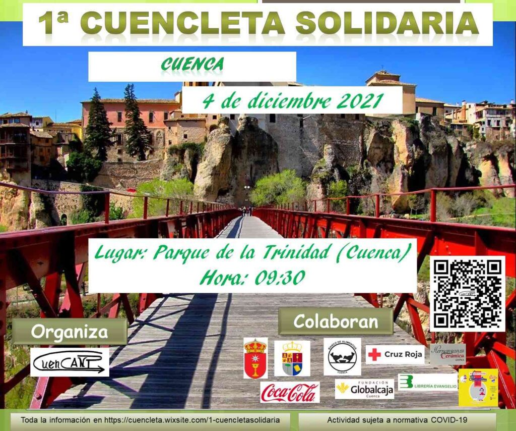El sábado 4 de diciembre se celebra la I CUENCLETA SOLIDARIA. El OBJETIVO es contribuir a una Navidad lo más digna para las familias y personas más necesitadas. De esta forma la Asociación Cultural “CuenCANP” organiza esta actividad con el apoyo de distintas entidades y que tendrá su punto de salida en el Parque de la Trinidad a las 9:30 de la mañana.
