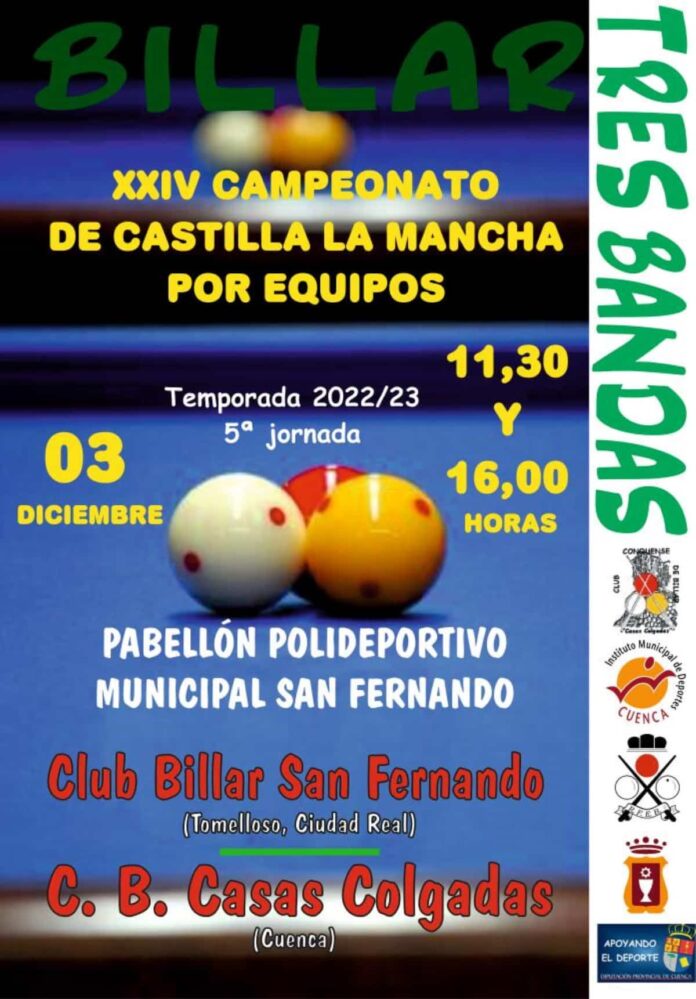 Amantes del deporte, este 3 de diciembre llega el Billar a tres bandas del XXIV Campeonato de Castilla-La Mancha por equipos. La cita es a las 11,30 y 16,00 horaas. La 5ª jornada de la temporada 2022-2023.