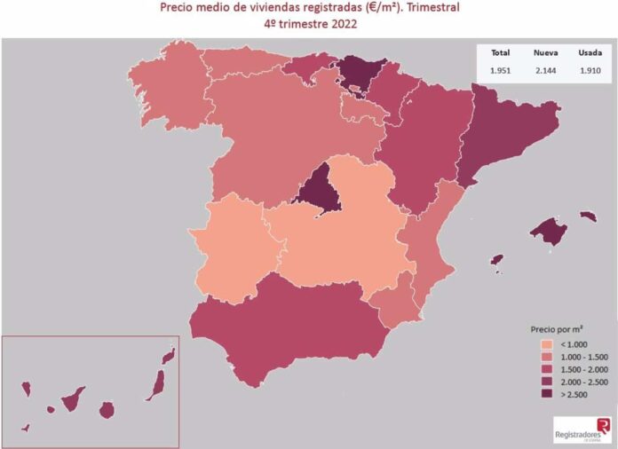 A nivel nacional, el precio de la vivienda en España se redujo un 0,4% en el último trimestre de 2022 respecto al periodo anterior. Más de 150.141 compraventas de vivienda se inscribieron en los registros de la propiedad, un 10,6% menos que el trimestre anterior. La vivienda nueva representó dos de cada diez operaciones, revalorizándose un 2,5% en ese periodo. El precio medio de la vivienda se situó en 1.951 euros el metro cuadrado, con Baleares siendo la región más cara. Por el contrario, Castilla-La Mancha y Extremadura fueron las únicas comunidades con precios por debajo de los 1.000 euros por metro cuadrado.