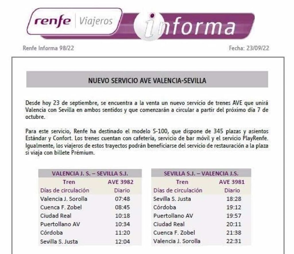 Cuenca, en Marcha! ha tenido acceso a una nota informativa emitida por Renfe hace una semana en la que sí contemplaba parada en Ciudad Real en ese trayecto con un tren de ida que salía de Cuenca a las 8.45 y llegaba a Ciudad Real a las 10.18 y otro de vuelta que salía de Ciudad Real a las 20.11 y que llegaría a la capital conquense a las 21.38. Dicha nota, denuncian, fue eliminada al saberse que no haría parada en ese municipio.