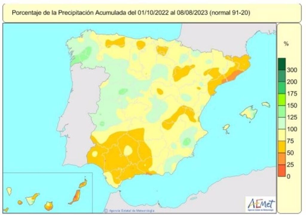 Según la Agencia Estatal de Meteorología (AEMET), el valor medio de precipitaciones acumuladas desde que comenzó el año hidrológico el 1 de octubre de 2022 hasta el 8 de agosto de 2023 ha aumentado un punto porcentual esta semana, alcanzando un déficit del 16 por ciento con respecto a lo normal para este periodo.