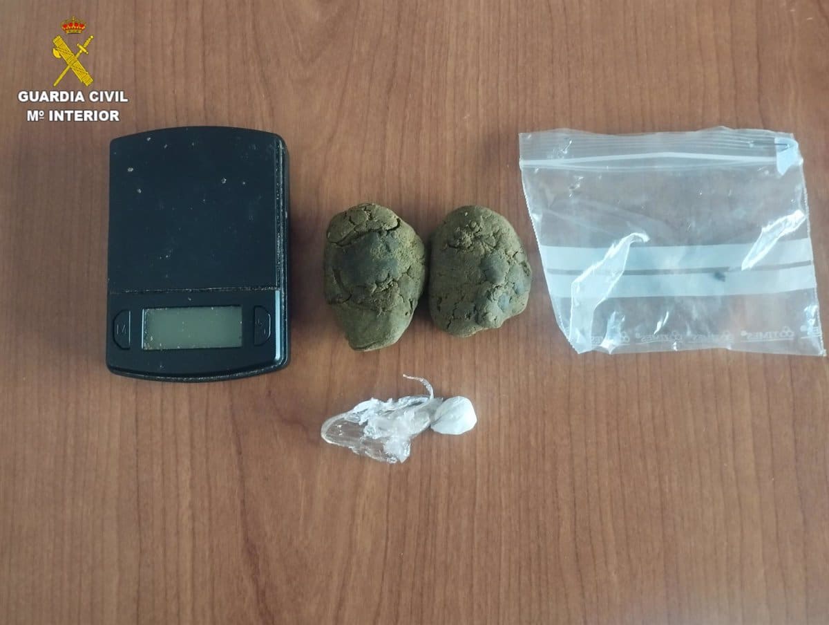 Los efectivos de la Guardia Civil conseguieron interceptar el vehículo y, ante la reacción del conductor de descender rápidamente en un aparente intento de distraer a los agentes, se procedió a registrar el vehículo. El resultado del registro fue el hallazgo de dos piedras de hachís con un peso aproxmado de 25 gramos, una báscula de precisión y un envoltorio plástico conteniendo una dosis de 1 gramo de cocaína.