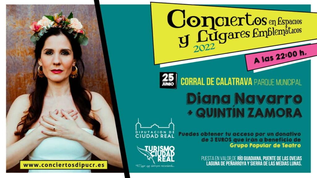Anota en la agenda que Diana Navarro + Quintín Zamora se presentan el próximo sábado 25 de junio en el parque municipal de Corral de Calatrava. Otro de los estupendos Conciertos en Espacios y Lugares Emblemáticos de la Diputación de Ciudad Real.