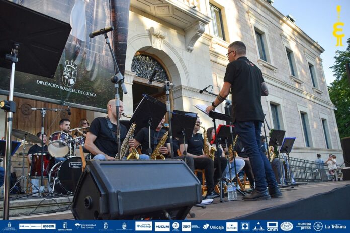 La Big Band UCLM se deleitó ante más de un centenar de asistentes que abarrotó el acceso al Palacio provincial de Diputación, disfrutando de un concierto musical al aire libre y cargado de temas de jazz, mambo, funky, soul… un repertorio que maravilló a los espectadores de la mano de los 28 músicos de esta particular orquesta impulsada por el ente universitario. Una vez más, Estival marca también su compromiso con las entidades académicas, cumpliendo en esta edición de nuevo con su apartado #EstivalUCLM en el que las formaciones de la Universidad de Castilla-La Mancha gozan de la oportunidad de actuar y hacer ver el talento y el trabajo que hay detrás de tanta formación.