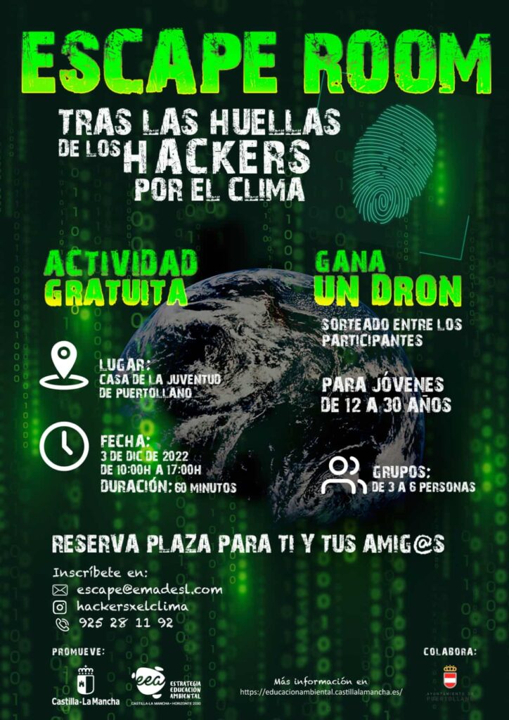 Este 3 de diciembre tendrá lugar un escape room gratuito “Tras las huellas de los hackers por el clima” en la Casa de la Juventud de Puertollano (Ciudad Real). Un evento que ha sido organizado por la viceconsejería de Medio Ambiente de la Consejería de Desarrollo Sostenible de Castilla-La Mancha. Y con la colaboración de la Dirección General de Juventud y Deportes de Castilla-La Mancha y la Concejalía de Juventud del Ayuntamiento de Puertollano. El que es desarrollado por la empresa educativa EMADE.
