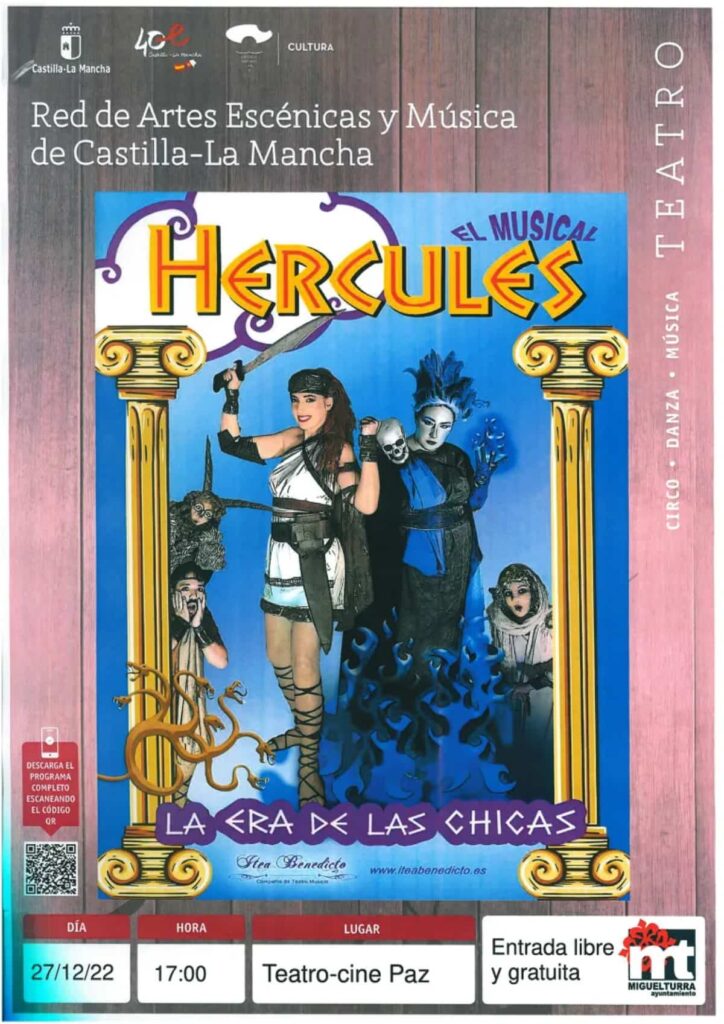 El espectáculo “Hércules, el musical; la era de las chicas” se presentará el martes 27 de diciembre de 2022 a las 5 de la tarde en Teatro Cine Paz, ha informado el área de Cultural del ayuntamiento de Miguelturra (Ciudad Real). El mismo a cargo la compañía de teatro Itea Benedicto, orientado a todo el público y con entrada gratuita hasta llenar aforo.