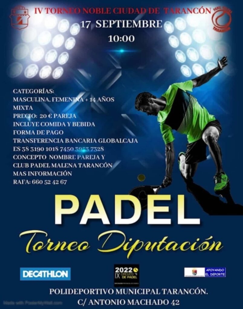Este 17 de septiembre la emoción del deporte llega con el Trofeo Noble Ciudad de Tarancón. Que forma parte del Torneo Diputación de Pádel de la Diputación de Cuenca. La cita es en el Polideportivo Municipal de Tarancón a las 10 horas. c/Antonio Machado, 42.