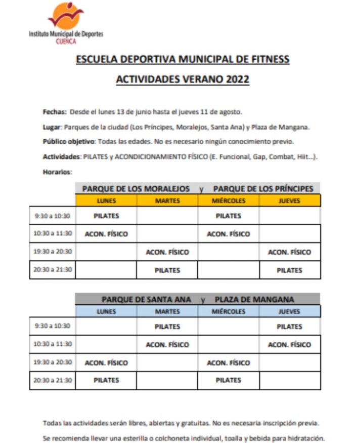 Las clases las impartirán monitores profesionales y serán de lunes a jueves, dos sesiones por la mañana y dos por la tarde, evitando las horas de más calor y alternando los espacios. El programa completo se puede consultar en las páginas web y redes sociales del Ayuntamiento de Cuenca y la Casa del Agua Sport.