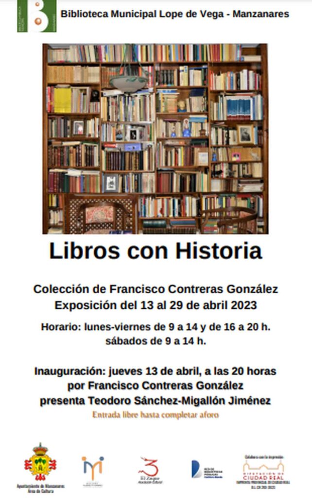La exposición Libros con Historia será inaugurada el próximo 13 de abril a las 20 horas en la Biblioteca Municipal Lope de Vega de Manzanares (Ciudad Real) y permanecerá abierta hasta el 29 de abril de 2023.