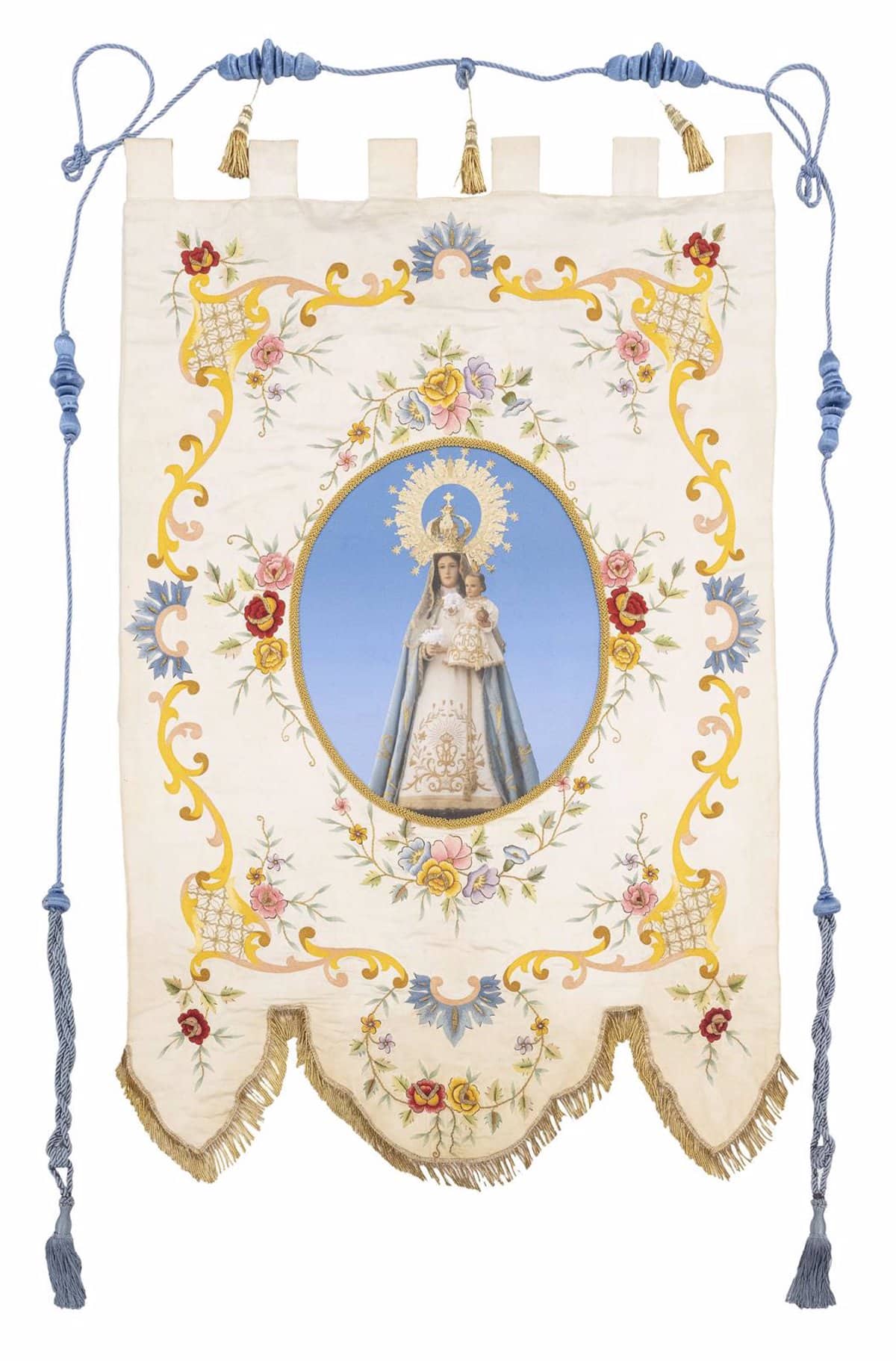 La Real Fábrica de Tapices, emblema de preservación del patrimonio textil español y la manufactura más antigua funcionando desde 1721, ha culminado la restauración del estandarte de Nuestra Señora de los Remedios de la localidad de Horcajada de la Torre, situada en la provincia de Cuenca. Este delicado trabajo de conservación se llevó a cabo en la venerable pieza confeccionada en raso de seda de tonalidad cruda, realzado por una impresión fotográfica sobre lienzo que retrata a la Virgen en el medallón central.