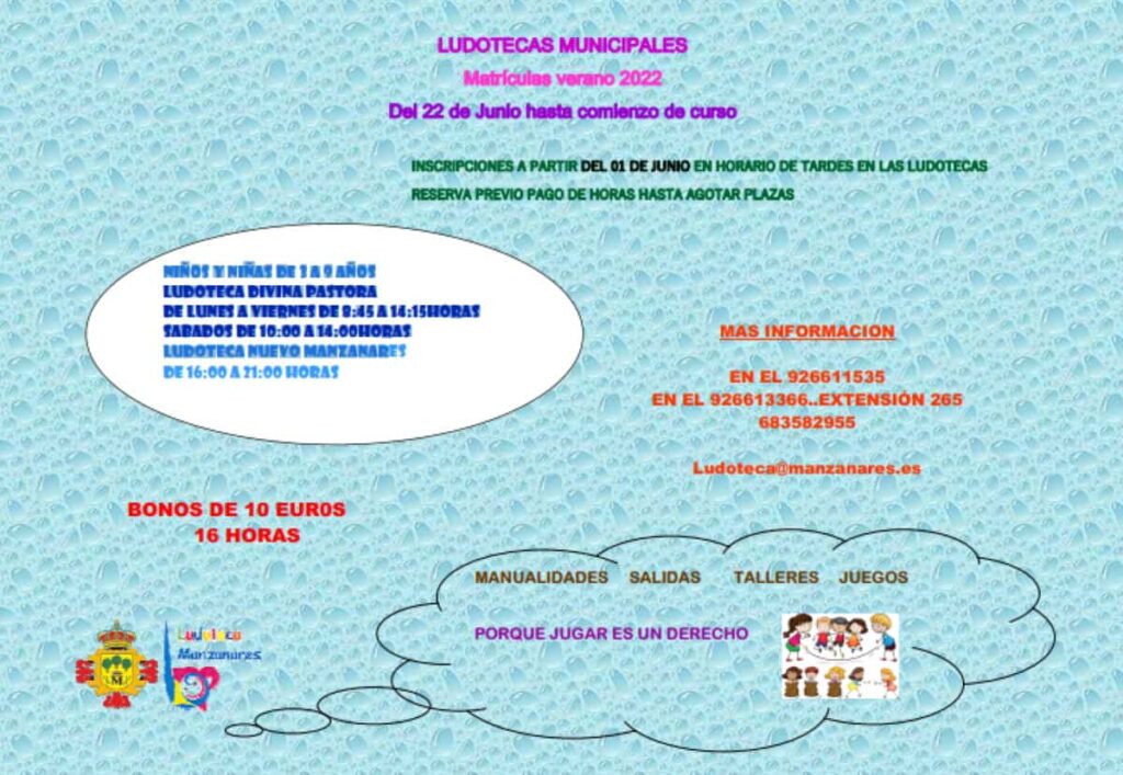 Las ludotecas municipales de Manzanares (Ciudad Real) ya se encuentran listas para brindar su atención a los niños y niñas de 3 a 9 años de la localidad, en este verano. Así que las matrículas verano 2022 del 22 de junio hasta el comienzo del curso.