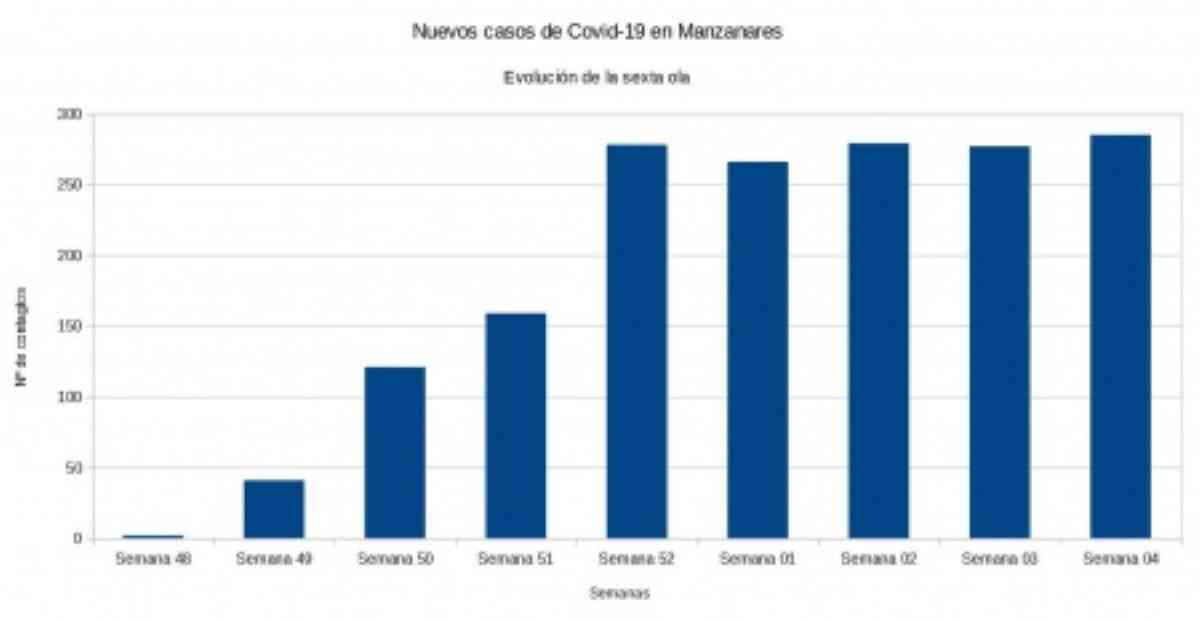 Nuevos casos positivos en Manzanares (Ciudad Real). Tal como se ha conocido, la evolución e los contagios en esta localidad, ha experimentado un ligero repunte en la que es la cuarta semana del 2022. De 277 casos reportados la semana anterior, se ha pasado a los 285 casos nuevos positivos contabilizados entre el 24 y el 30 de enero.
