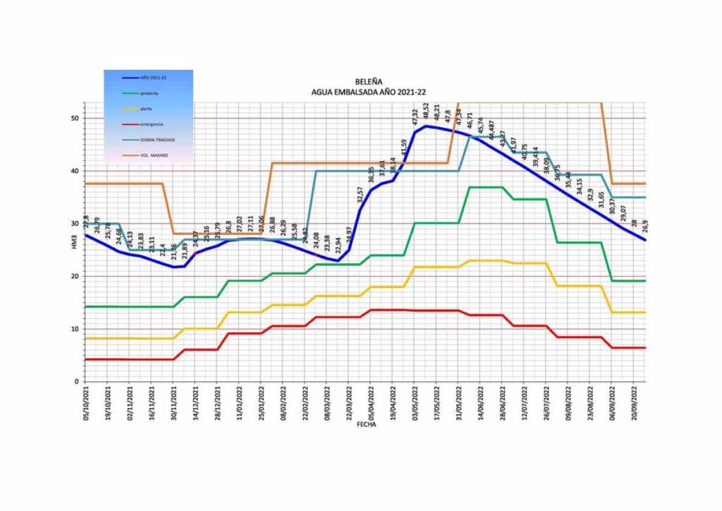 El embalse cuenta con una cantidad de agua almacenada próxima al 50% de su capacidad, pero con 2,5 hectómetros cúbicos menos que cuando comenzó el año hidrológico. Y los seis primeros meses de 2021, que se corresponden con el otoño y el invierno, fueron más secos que los años anteriores, y aunque no se llegó a rozar el nivel de pre alerta, en el mes de marzo estuvo muy cerca.