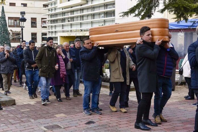 Con la conmoción reflejada en el rostro de sus vecinos, en torno a 200 personas se han congregado a las puertas de la iglesia de San Marcos Evangelista antes de las 11.00 horas. Pasados unos minutos llegaban hasta la plaza Mayor la pompa fúnebre con tres vehículos.