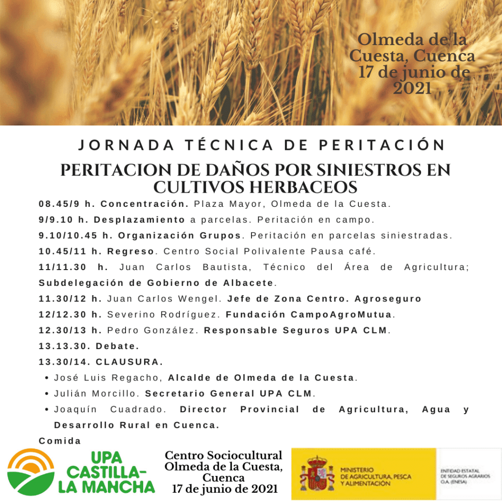 De acuerdo a lo informado desde UPA, se trata de la primera jornada de este tipo que se organiza después de muchos meses de parón obligado y se eligió la localidad de Olmeda de la Cuesta a causa de los daños que se sufrieron en distintas explotaciones en fechas recientes. La jornada comenzará a las 8.45 h. para encaminarse a las parcelas dañadas, donde diversos grupos realizarán prácticas de peritación en parcelas siniestradas de diversa intensidad.