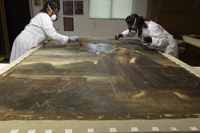 La necesidad de restauración fue apremiante debido a problemas como la pérdida de tensión, cortes en la tela y una manipulación previa desafortunada. La obra requirió un desmontaje cuidadoso y fue asegurada a un soporte temporal durante su traslado al taller. Allí, las capas pictóricas descamadas fueron afirmadas, se procedió a la limpieza de suciedad superficial que reveló la firma del autor y se retiraron parches ubicados en la parte posterior antes de abordar su reentelado completo.