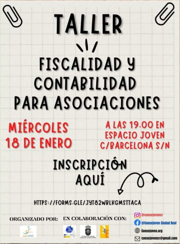 Un taller de fiscalidad y contabilidad para asociaciones tendrá lugar el próximo 18 de enero en el Espacio Joven de Ciudad Real, situado en c/ Barcelona s/n de Ciudad Real.