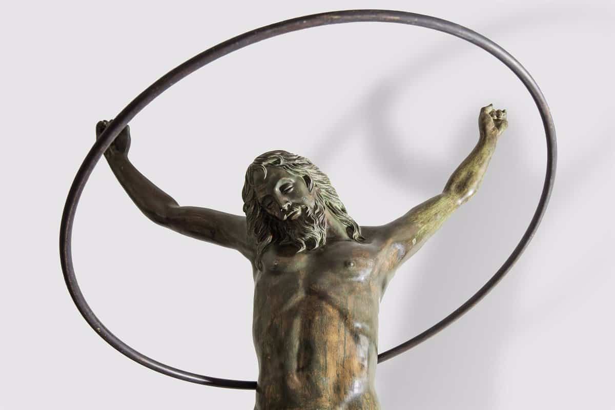 La figura de Cristo, que con los brazos extendidos asciende al cielo, y el círculo que la encierra están fundidos en bronce patinado en verde claro. La peana, con una pátina verde oscuro, está construida de planchas de latón plegadas y soldadas. Según su autor, «la iconografía de la escultura hace referencia al círculo, que simboliza el nacimiento, muerte y resurrección de Jesucristo para salvarnos y regalarnos la Vida Eterna». «Jesucristo muerto es el eje inmóvil de la rotación del ciclo del devenir», añade.