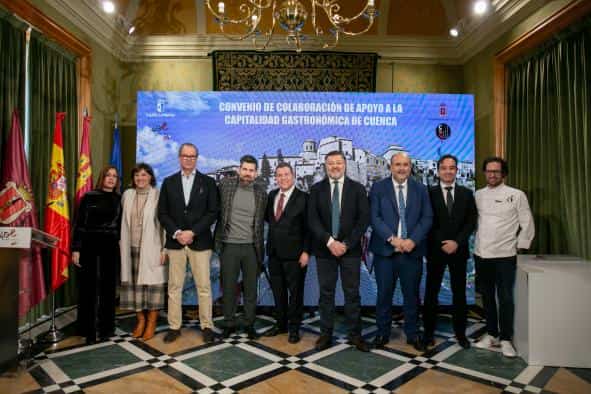 Emiliano García-Page, presidente de Castilla-La Mancha, se encontraba hoy en Cuenca para firmar un convenio de colaboración con el Ayuntamiento de la ciudad con el objetivo de desarrollar la “Capitalidad Gastronómica de Cuenca” durante el presente año 2023, con una dotación de 200.000 €. Durante su discurso, el Presidente también anunció que una multinacional está ultimando su decisión de establecerse en la capital conquense, lo que generaría un centenar de empleos. “Crucemos los dedos”, dijo García-Page. Además, el presidente también se refirió a la puesta en marcha del Nuevo Hospital Universitario de Cuenca y al proyecto “Toro Verde”, que según él, “va a llegar más lejos de lo que se había pensado y también generará más puestos de trabajo de los previstos”. Por último, el Presidente se mostró convencido de que la “Capitalidad Gastronómica de Cuenca” sería un título honorífico y una oportunidad para la ciudad.