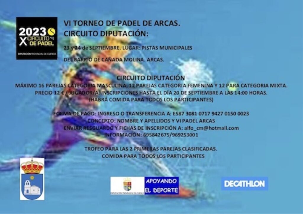 El VI Torneo de Pádel de Arcas del X Circuito de pádel de la Diputación de Cuenca, tendrá lugar los próximos 23 y 24 de septiembre . Ya se encuentra abiertas las inscripciones hasta el 20 de septiembre a las 14 hrs.