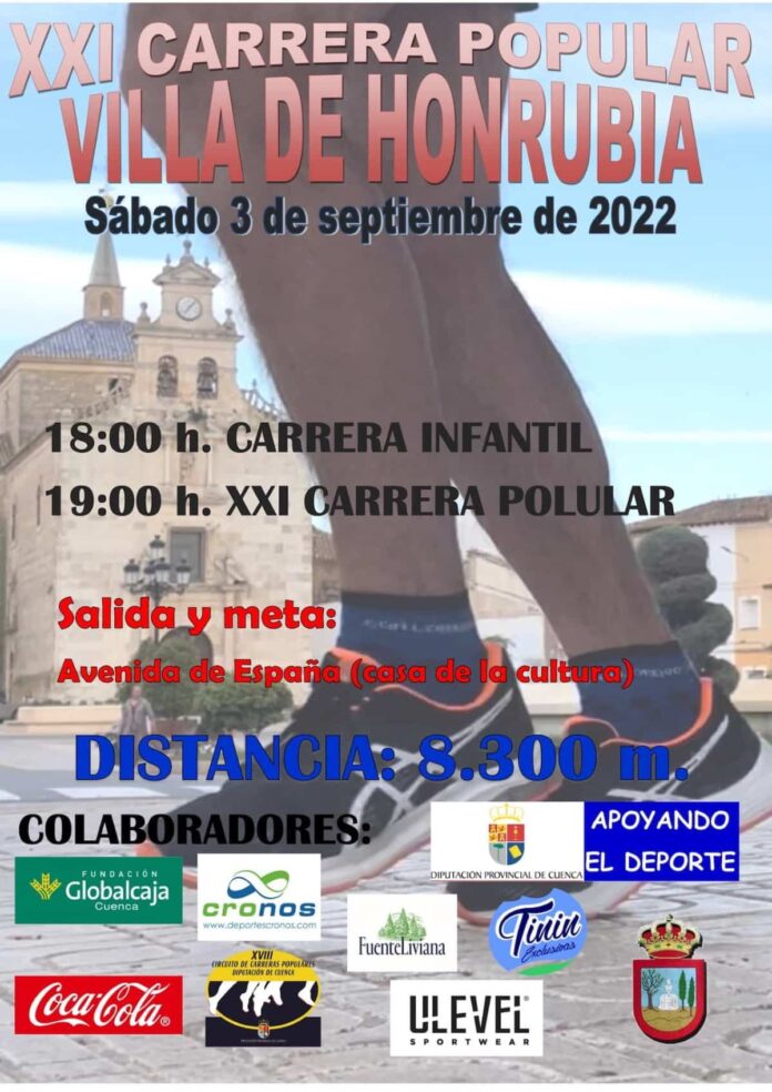 Y con septiembre llega la XXI Carrera Popular Villa de Honrubia 2022. La que se celebrará el día sábado 3 de septiembre a las 19 horas. Con una distancia de 8.300 mts mixto. Organizada por el ayuntamiento de Honrubia. Con salida en la avenida de España, casa de la cultura, en donde será también la meta.